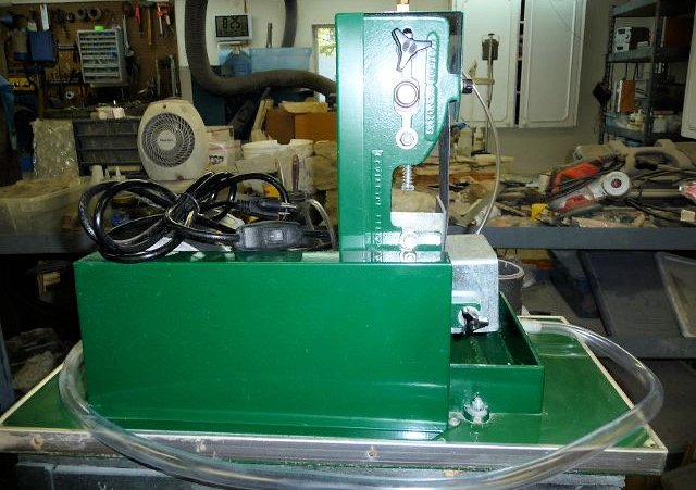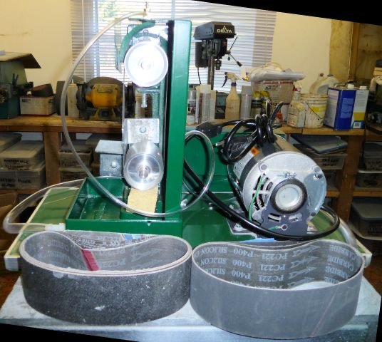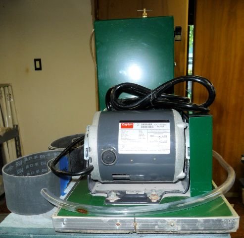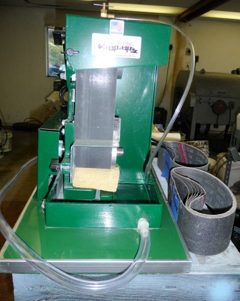 This machine priced to sell and is ready to run right now! The gentleman we acquired it from said he bought the machine new, used it a couple times and decided that it didn’t match his needs. Comes with a supply of belts (5) 220, 2) 100, 2) 400, 2) 600), plus 1 slightly used 220 on the machine, and we added water inlet and outlet hoses. All you need is to drill out a container, glue the tubing to it or drill a hole and screw a couple dollar barb fitting in (Our preference). The manual is here.