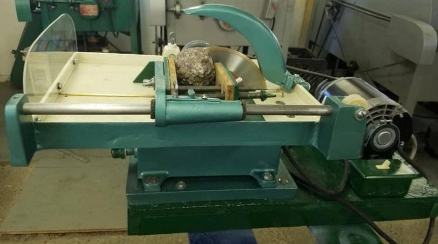 This is a completely rebuilt trim saw from a Highland Park trim saw/cabochon/polishing machine. Completely stripped, primed, painted, and clearcoated. New pulleys, belt, 1/4 horsepower motor, wiring, switch, sturdy base, splash shield, bearing, and MK Diamond 301 blade. It has a traveling vise with a weight feed system, just add string and a weight, or feed it by hand. It also has a guide on the opposite side for trimming slabs. You can use oil or water with an anti-rusting additive like Lube Cool or Crystal Cut. The drain is in the front so you can easily empty it after you’re done if you’re using water.