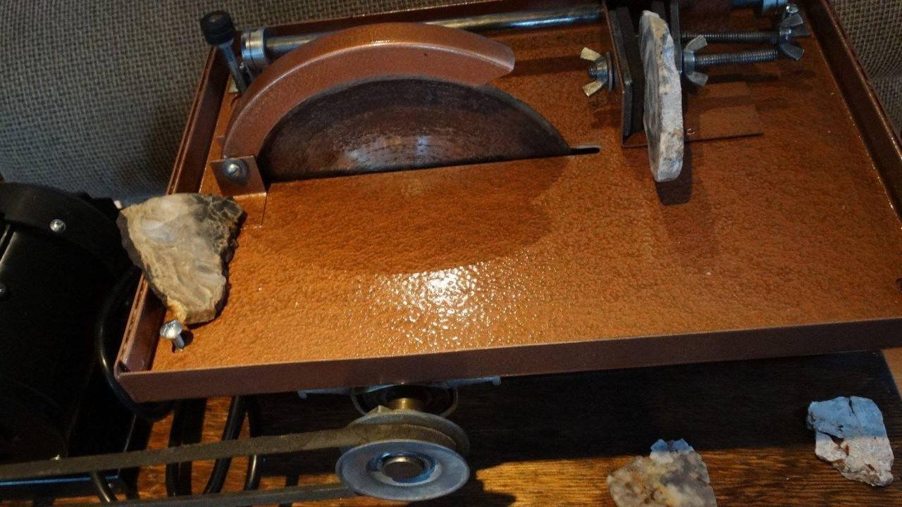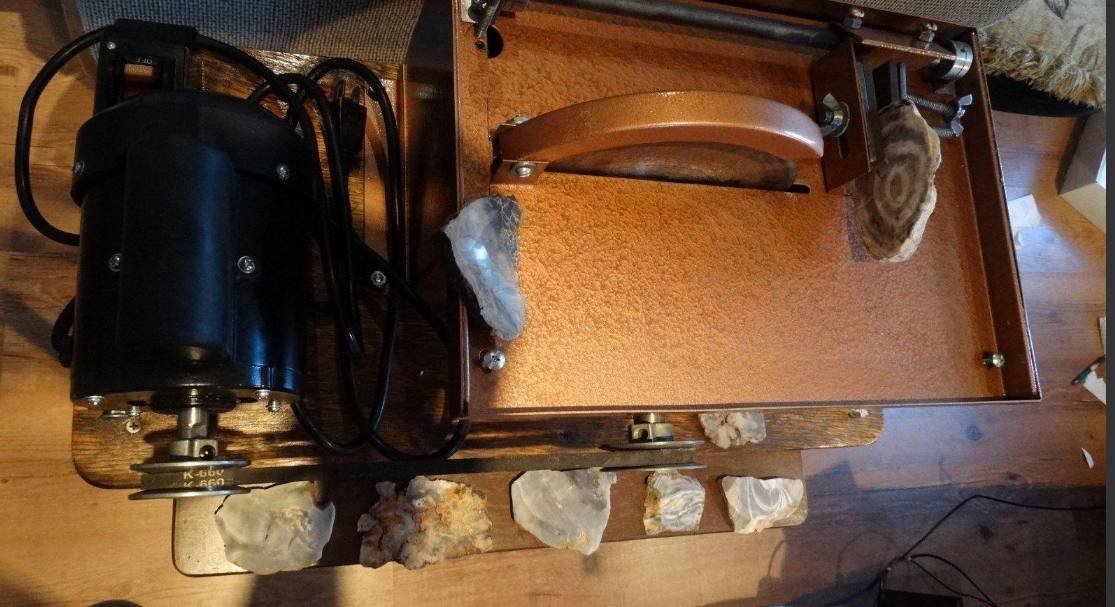 UP FOR SALE I HAVE A LORTONE TS8 LAPIDARY8 INCH WET SLAB SAW WITH ROCK VISENEW MOTOR SWITCH AND CORD ALL MOUNTED ON STAINED WOOD BASE PAINTED WITH COMMERCIAL HAMMERED COPPER PAINT THIS IS LIKE NEW AND A QUITE MACHINE THIS IS A GREAT MACHINE THE MOTOR PULLY HAS SLIGHT WOBBLE I WILL TRY AND ADJUST IT OUT IF NOT MIGHT WOBBLE THE BLADE IS USED BUT WILL STILL CUT GREAT BLADE HAS SURFACE RUST I WILL SEND ONE QUART LORTONE CUTTING OIL WITH THE SAW THE STONES ARE NOT INCLUDED WITH THE SALE PLEASE CONTACT FOR MORE INFO.