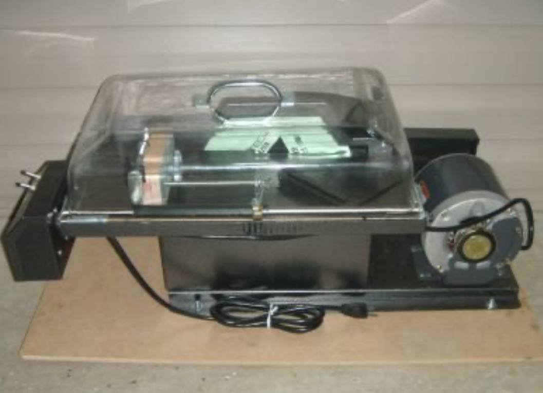 Up for auction is a new Raytech 10 inch lapidary rock saw, model number AL-P10S. It has not been used, and comes with the everything shown and the manual and receipt w it was purchased 8-25-2005 for $960 + S&H. This same saw is now selling for $1,200-1,400 at several different websites. The model is still being currently made and is widely hailed as the best rock saw you can buy. It has the very nice feature of a power cross feed of the slide. The plastic shield is present, and it comes with a new blade in it also. You can visit the manufacturers website for more information and specs on it. SATISFACTION GUARANTEED with a one week return period, buyer pays shipping and insurance both ways if needed. I accept PAYPAL, MO, and personal checks with a 14 day waiting period to ship (checks only). It will have a shipping weight of app 80lbs, my zip code is 63747, if you want to go to and calculate some shipping expenses.