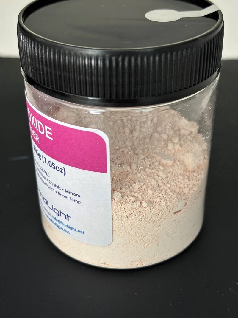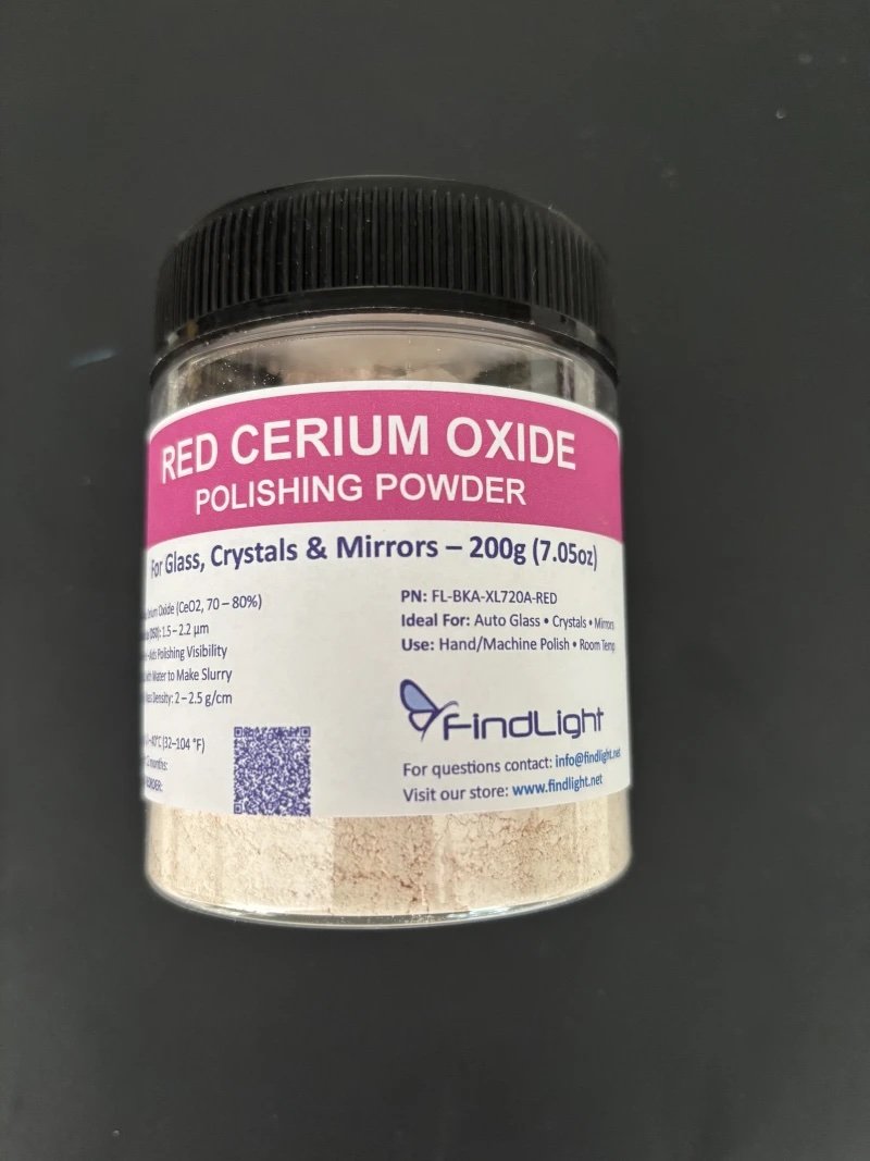 The polishing powder features a particle size (D50) of 1.5–2.2 µm and a high cerium oxide content (70–80%), making it perfect for applications where high precision is not a requirement but a smooth, spotless surface is desirable. Its pH range (6–8) ensures that it is gentle on glass while delivering effective material removal. The red color aids visibility during the polishing process, enhancing the user experience. Preparation is straightforward with a standard mixing ratio of 1:10 (powder to water), allowing for easy creation of a slurry. The mass density of 2–2.5 g/cm³ contributes to consistent polishing action.